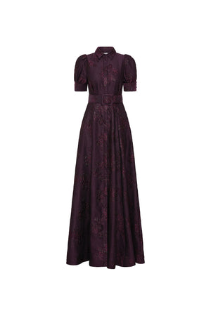 The Afina Short Sleeve Gown in blackberry exudes refined elegance with its brocade fabric and sleek collared neckline. Designed with short puff sleeves accented by cuff detailing, this gown balances timeless charm and contemporary style. A self-belt defines the waist, while the voluminous circular skirt flatters every movement. Practical side seam pockets and a concealed placket enhance its polished look. Fully lined and featuring a removable slip dress with adjustable straps, this versatile piece is perfect for sophisticated occasions.