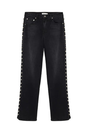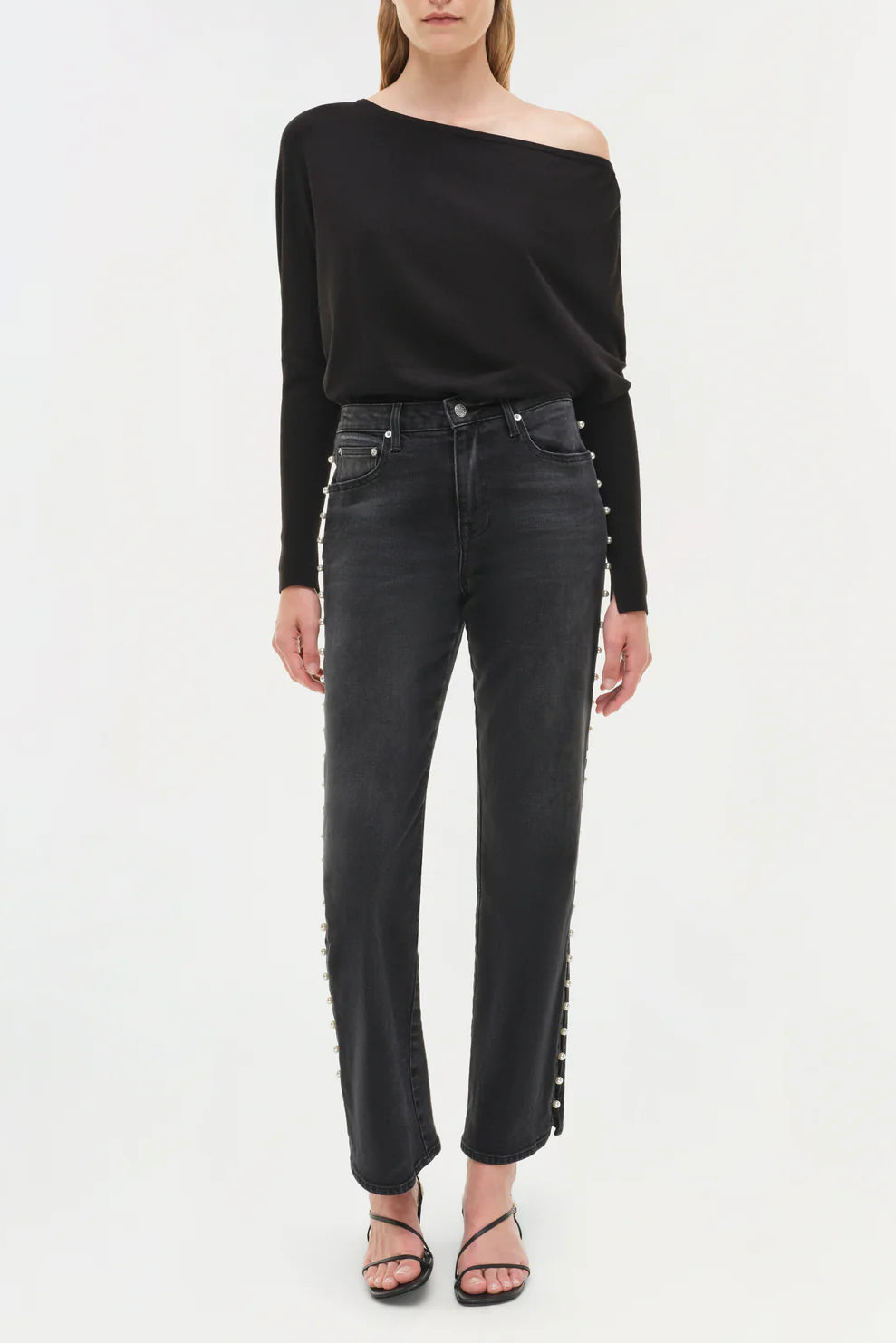 Elevate your denim collection with the Amelia High Rise Pant, a timeless straight leg silhouette crafted with classic five-pocket construction. Delicate pearl embellishments trace the side seams, adding an understated touch of refinement to this wardrobe essential. Perfect for effortless styling from day to evening, this sophisticated jean pairs beautifully with everything from crisp white shirts to flowing blouses.