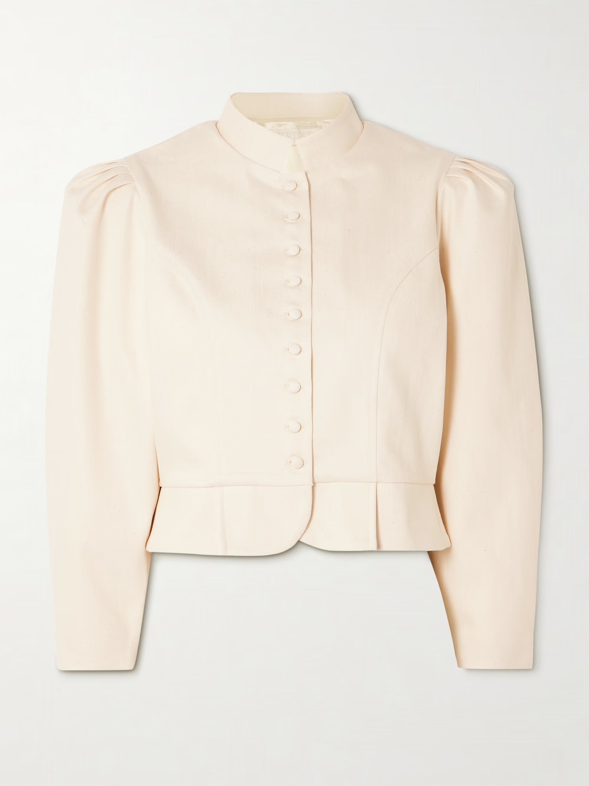 The Amoako Denim Jacket elegantly reimagines 1950s style with a modern edge. Its cropped design is enhanced by a mandarin collar and voluminous puff sleeves, while the fitted waist sculpts a refined, artistic silhouette. This jacket effortlessly combines vintage inspiration with contemporary sophistication, making it a statement piece that elevates any wardrobe.