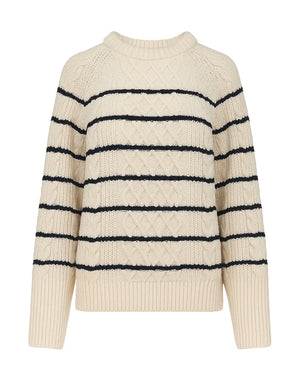 The Angus Sweater elevates the timeless fisherman’s design with luxurious, chunky 100% cotton knit. Featuring raglan sleeves and wide cuffs adorned with classic striped cable patterns, it offers enduring sophistication and unmatched comfort. This sweater is a refined staple that seamlessly blends heritage style with contemporary ease, making it an essential piece for any discerning wardrobe.