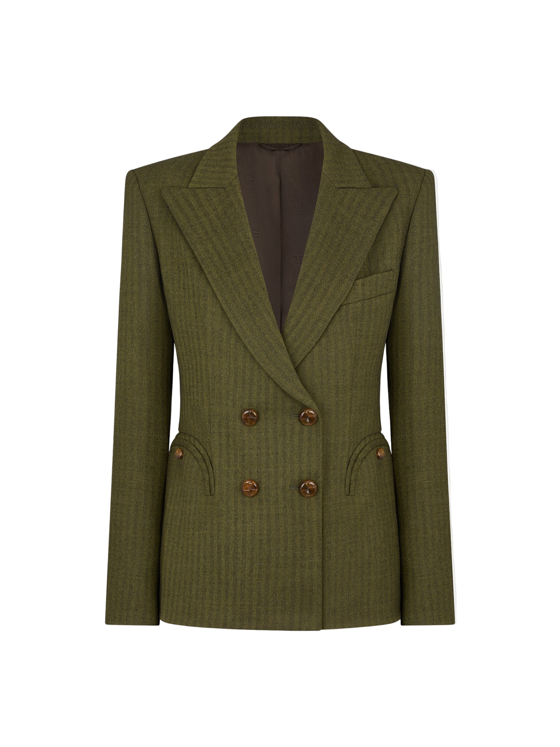 The Anouk Charmer Blazer is a refined reinterpretation of BLAZÉ Milano’s iconic hourglass silhouette, tailored from luxurious olive green virgin wool with a delicate micro-chevron pattern. Its double-breasted design and slim fit—with lightly padded shoulders and tortoiseshell-effect buttons—offer a flattering, structured look. Thoughtfully detailed with external Smiley pockets, an internal pocket, and a dark chocolate logo-lined interior, this blazer transitions effortlessly from day to evening, especially when paired with the matching Nana Pants.