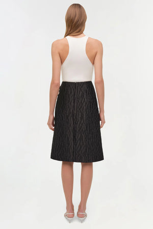 The Arla Midi Skirt combines refined elegance with practical versatility. Crafted from a premium polyester blend with subtle elastane for comfortable movement, this imported piece features a flattering midi length that transitions seamlessly from office to evening occasions. The structured shell maintains its polished appearance while the fully lined interior ensures a smooth silhouette. Dry clean only to preserve the fabric's sophisticated finish and longevity.