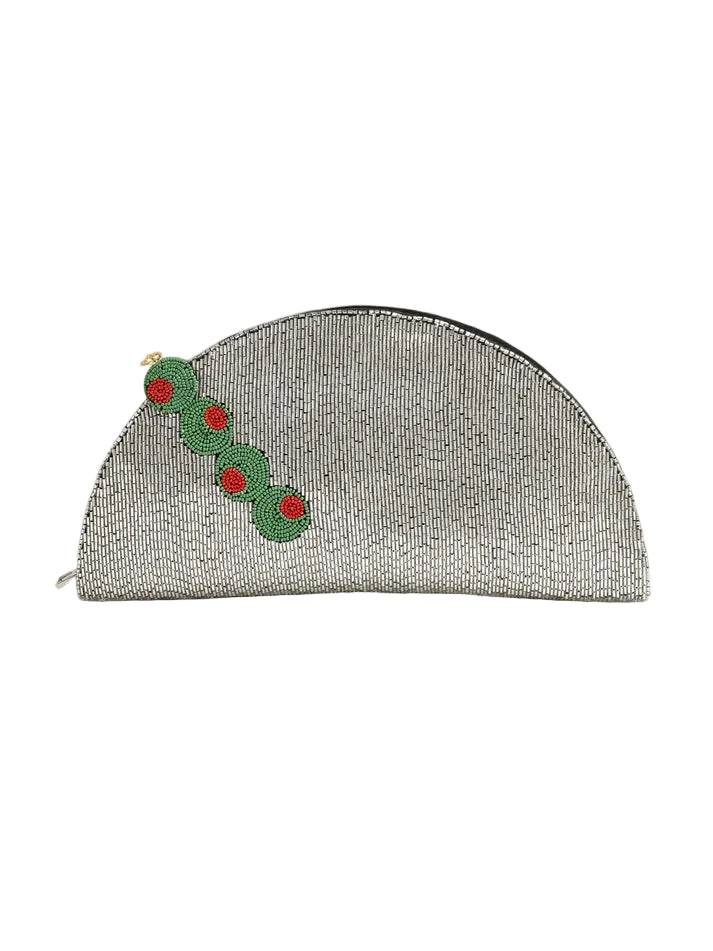 Elevate your evening ensemble with this captivating semi-circular clutch, entirely adorned in luminous glass beads that catch the light with every movement. A playful three-dimensional beaded olive cluster crowns the design, channeling the elegance of a classic martini moment. This sophisticated accessory delivers refined glamour and witty charm, transforming any formal occasion into an unforgettable celebration of style.