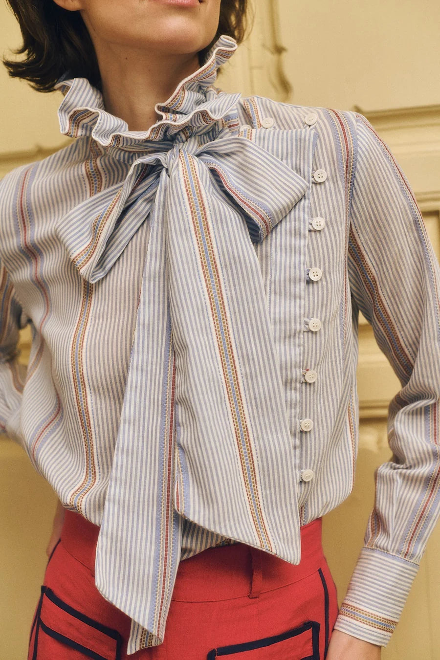 The Blake Shirt combines timeless style with charming details. This classic straight-cut design features a distinctive side button placket that extends to the collar, paired with a ruffled collar and matching ruffled sleeves secured with delicate two-button closures. Crafted from rustic-striped fabric, it delivers a vintage-inspired look perfect for adding character to any wardrobe. An effortless piece that works equally well dressed up or down.