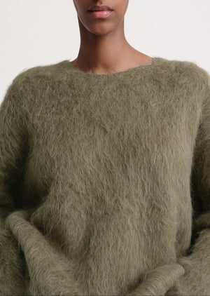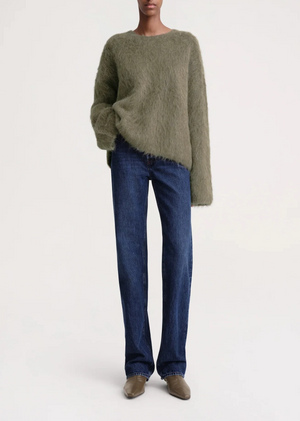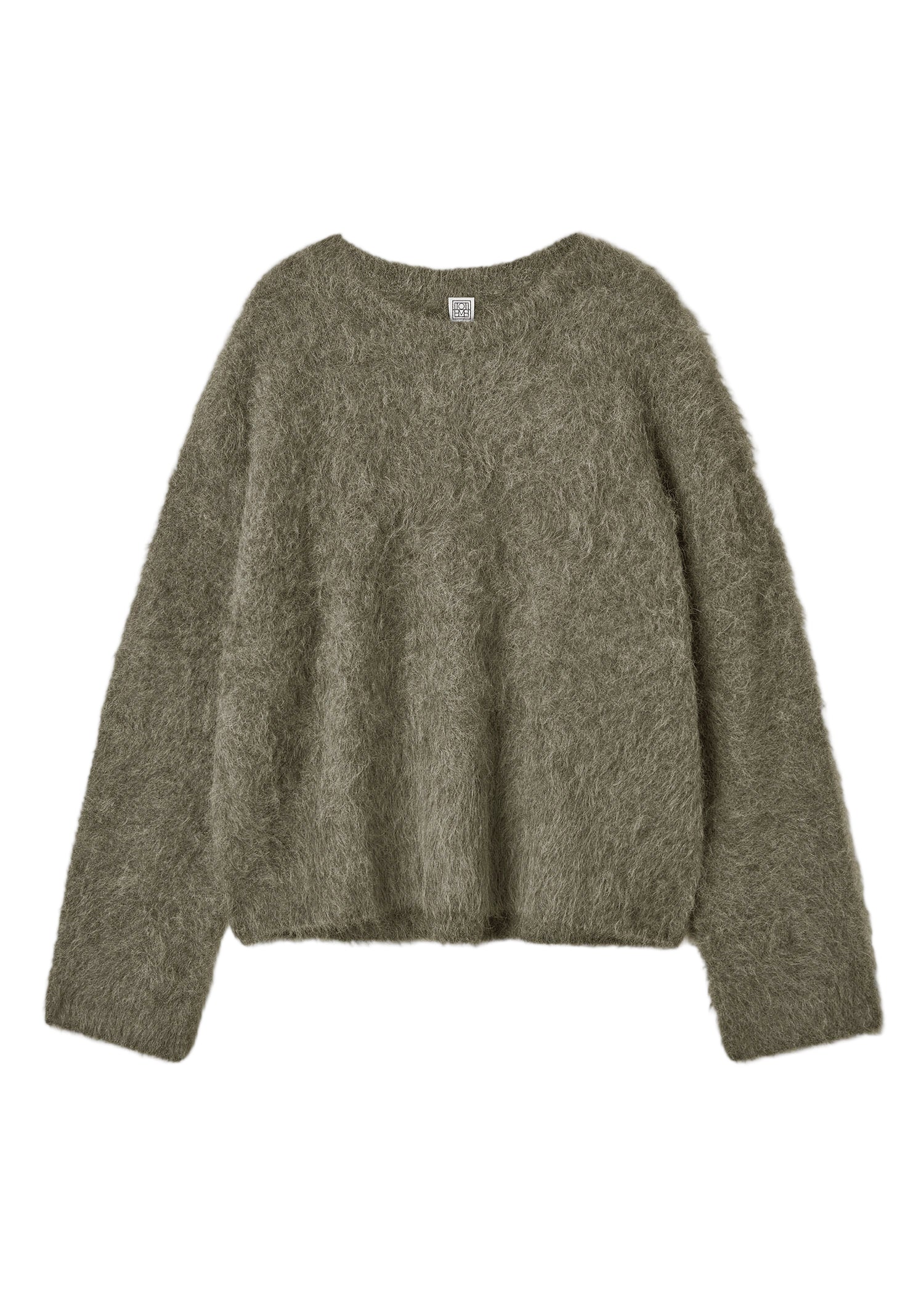 Crafted from a soft alpaca-blend yarn, this Boxy Alpaca Knit Sweater embodies relaxed elegance with its loose silhouette, dropped shoulders, and extended sleeves. The ribbed round neck adds subtle structure, while the lightweight, hairy texture invites cozy comfort. Perfectly paired with denim, it offers an effortless yet refined look. Designed for gentle care, this sweater requires a cold hand wash to maintain its luxurious feel.