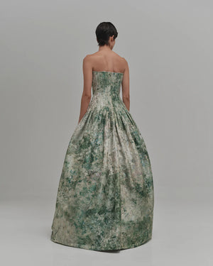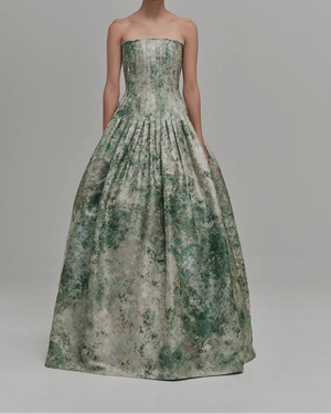 The Camelia Maxi Dress captures refined sophistication with its architectural design and commanding presence. A strapless fitted bodice creates a graceful neckline, while the voluminous pleated skirt commands attention with fluid movement and dimension. The textured floral print adds visual intrigue without compromising elegance, making this piece an unforgettable choice for galas, formal dinners, and milestone celebrations. This is a dress designed to be noticed—a timeless investment for those who appreciate couture-inspired craftsmanship and understated luxury.