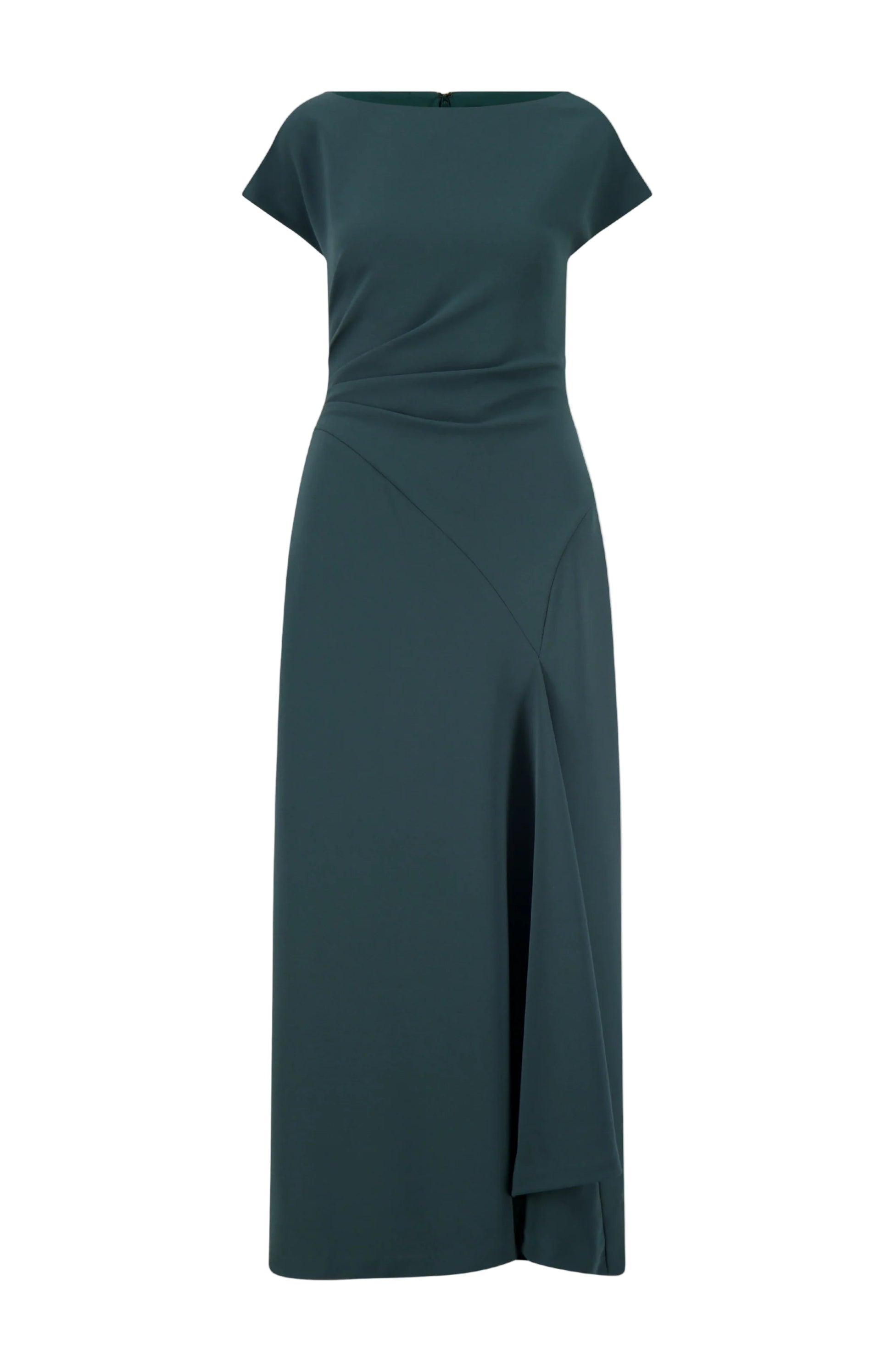 The Cascade Dress, an exclusive in-store design for Lela Rose Dallas, exudes refined elegance. Crafted from signature fluid crepe, it features a flattering bateau neckline with delicate cape cap sleeves and a draped bodice highlighted by a waterfall seam. The flowing kick pleat hem adds graceful movement, while a fitted waist enhances your silhouette. Finished with a concealed back zipper and hook & eye closure, this beautifully lined dress offers timeless sophistication, perfect for elevating any celebration or cocktail event. Made in the USA and designed to impress.