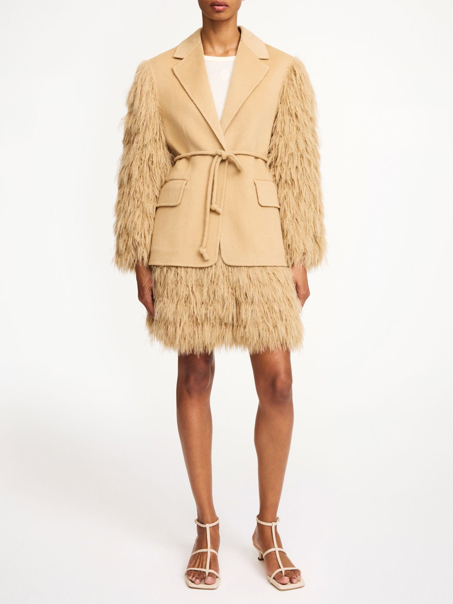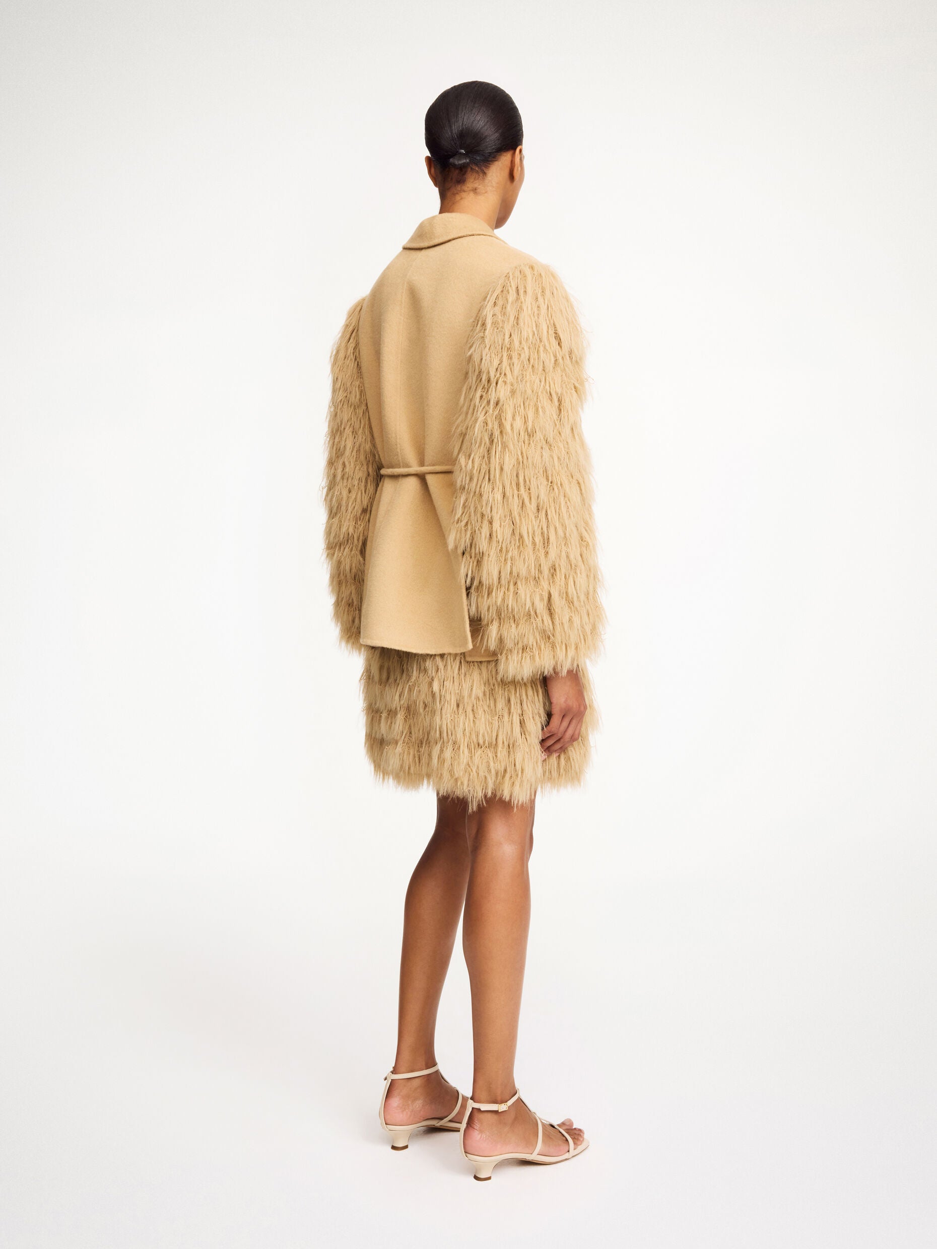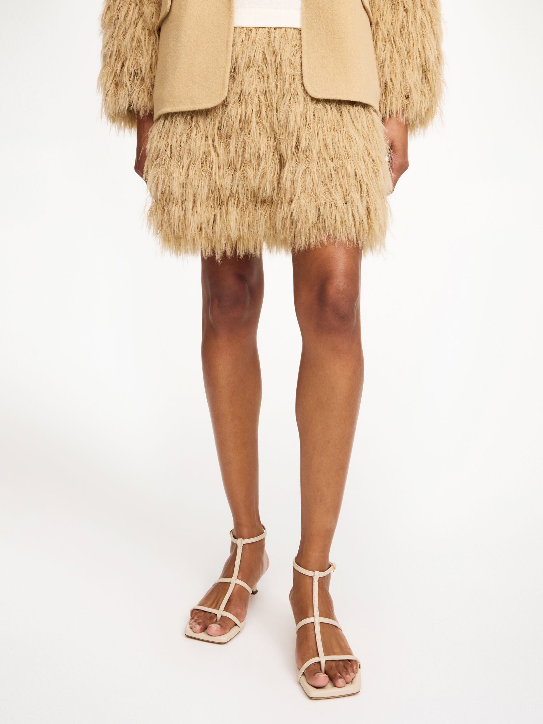 The Chamie skirt from By Malene Birger offers a fresh take on fringe for contemporary style. Designed with a soft elastic waistband and fully lined, this mini skirt showcases light, feathery fringes that flow gracefully with each movement. Its regular fit allows for effortless styling versatility. To complete a refined bohemian look, style it alongside the matching Manteau blazer, creating an elegant yet carefree outfit.