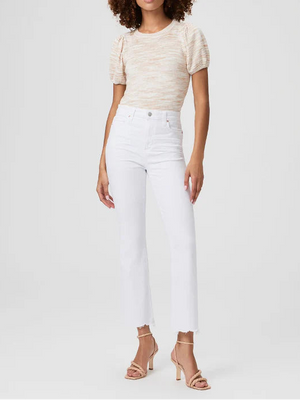 Paige’s Claudine Jean features a sophisticated ankle-crop silhouette with a high waist and flared leg, complemented by a raw hem for modern edge. Crafted from a comfortable blend of 98% cotton and 2% elastane, these jeans offer subtle stretch and a flattering fit. Designed with belt loops, a banded waist, classic five-pocket styling, and a zip fly with button closure, they blend timeless details with contemporary style. Easy to care for, simply machine wash to maintain their sleek look.