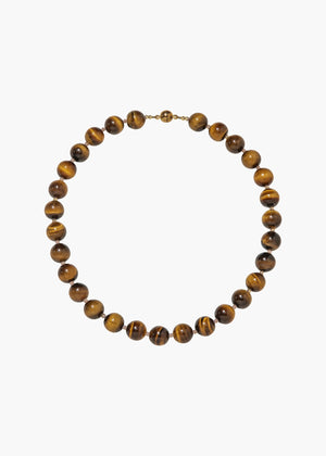 The Corisande Necklace showcases striking semi-precious tiger's eye beads, each displaying nature's distinctive golden-brown veining. Traditionally valued for promoting courage, protection, and mental clarity, these substantial stones are elegantly interspersed with 18-karat gold-plated seed beads for refined contrast. The convenient magnetic clasp ensures effortless fastening, making it equally stunning worn alone or layered with complementary pieces. Length: 17 inches.