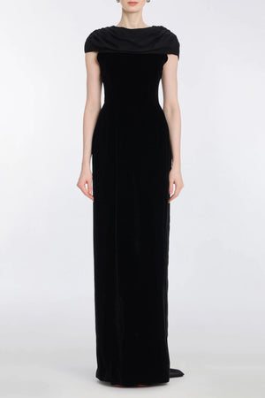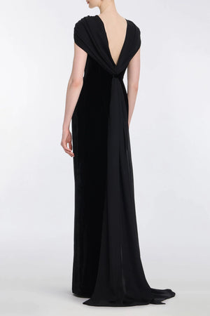 Elegant corseted bodice gown featuring a sleek straight skirt, luxurious silk georgette shawl, and graceful train. Crafted from a refined blend of 82% rayon and 12% silk with a sumptuous 100% silk lining for comfort and drape. Discreet back zip closure ensures a seamless silhouette. Made in the USA with meticulous attention to detail. Dry clean only.