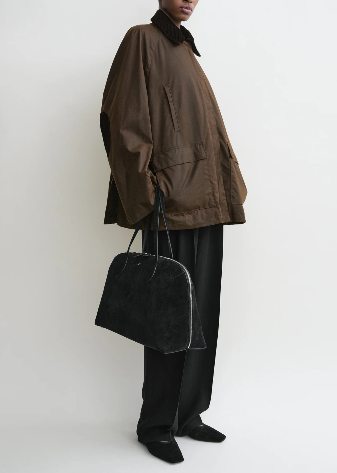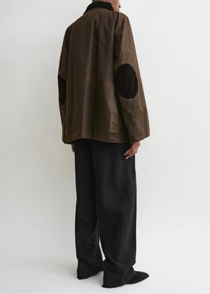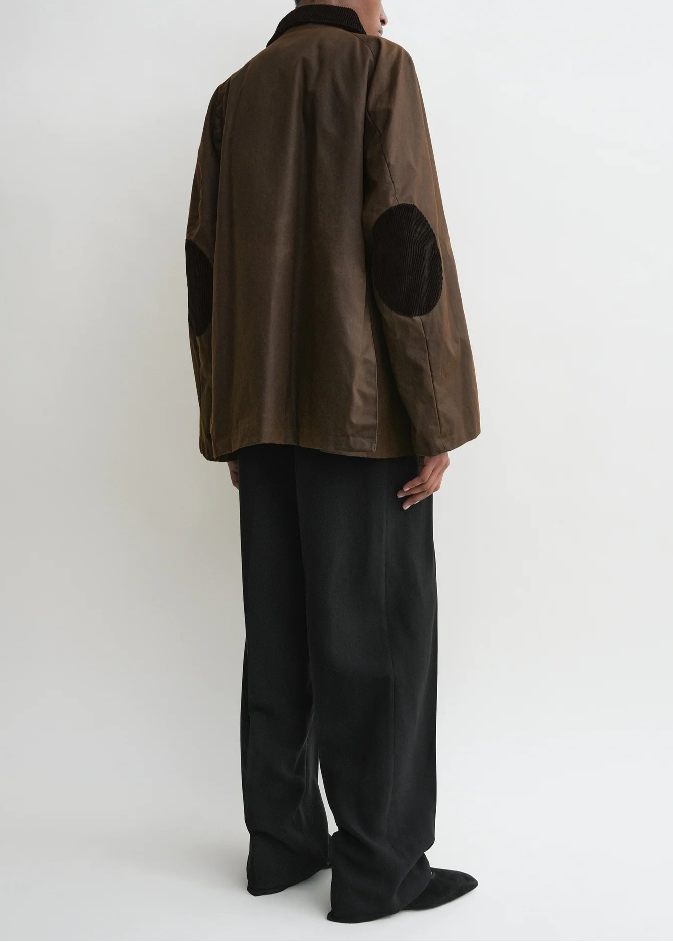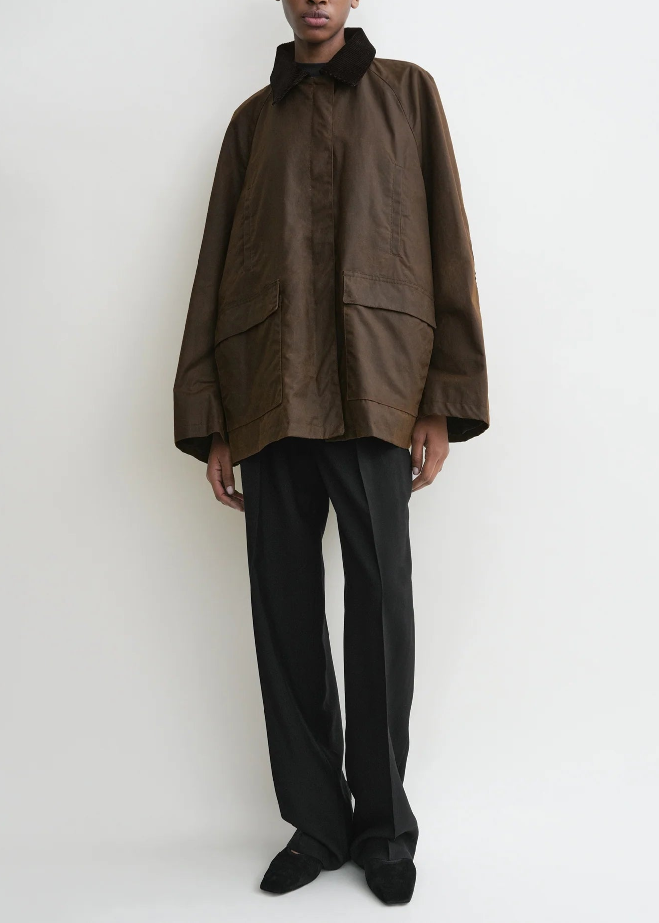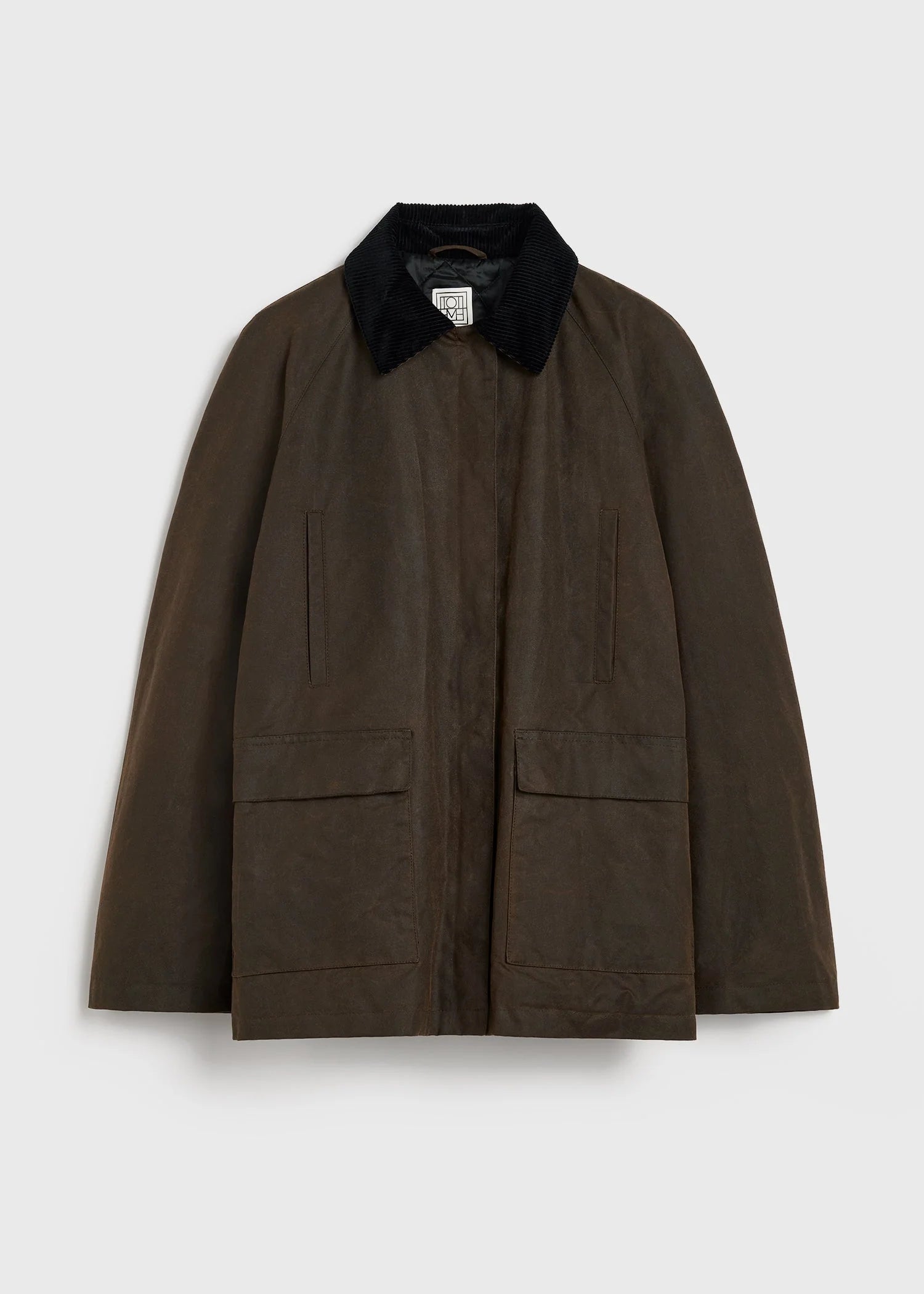 Oversized TOTEME jacket made from waxed cotton sourced from British heritage weavers and dyed in a new brown shade named bark. It has a very spacious A-line silhouette accented with a black corduroy collar and elbow patches, a zipper and press-stud front, multiple front pockets, and two back vents.