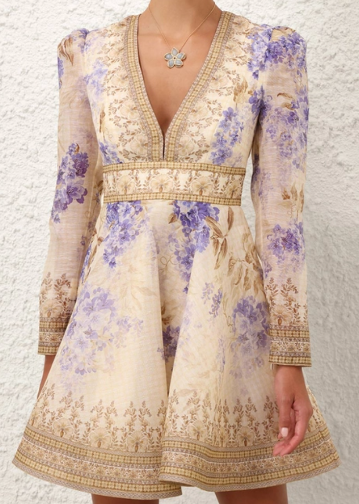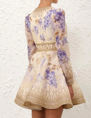 The Zimmermann Dawning Plunge Mini Dress in Lilac Floral from our Spring 2025 Collection, Illumination. A silk linen mini dress featuring a plunging V-neckline and fixed waistband, finished with long sleeves and a full skirt.