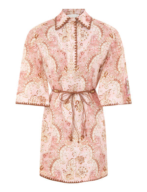 The Daylight Tunic Mini in Damask Rose brings effortless elegance to your warm-weather wardrobe. Crafted from breathable linen, this Resort Swim 2026 piece features a refined silhouette with a classic collar and flattering V-neckline. Midi-length sleeves with generous cuffs offer subtle coverage, while the removable macrame beaded belt cinches the waist with understated sophistication. Practical side pockets complete the design, making this versatile tunic dress equally suited for poolside moments or casual seaside escapes.