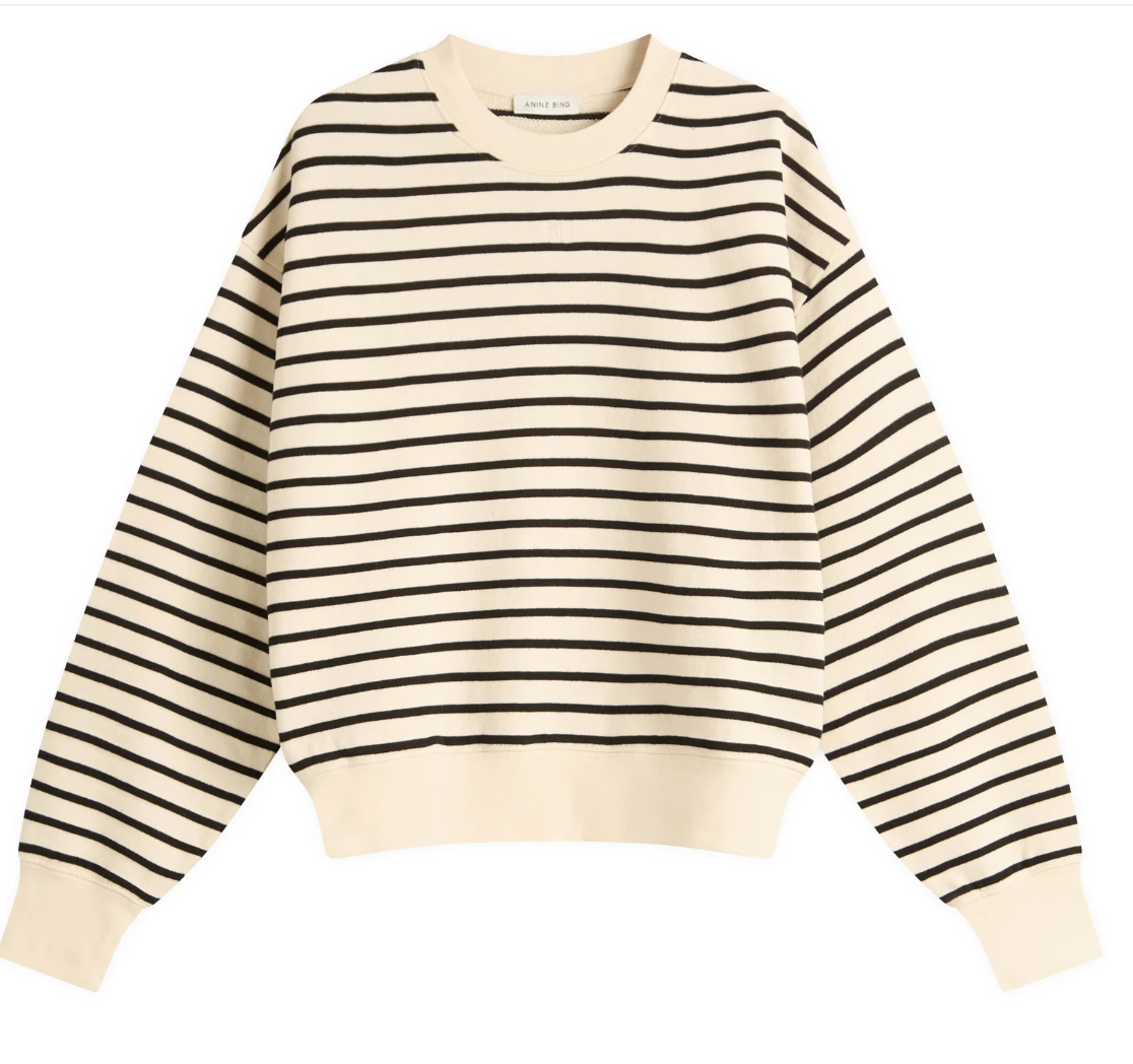 The Dean sweatshirt reflects Anine Bing’s signature blend of laid-back luxury and timeless design. Crafted from midweight French terry cotton blend, this relaxed crewneck features classic black and white Breton stripes for a nod to effortless Parisian style. Complete with subtle branding, it’s a staple piece that speaks to the brand’s modern, everyday uniform.