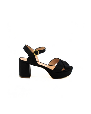 Deidre is our popular low platform shoe in Black Suede, featuring a 75mm block heel and a 30mm platform for added comfort. It includes a crossover toe strap and a buckled ankle strap, ensuring both stability and ease of wear. Expertly crafted by hand in Italy with black satin details.