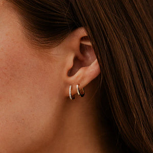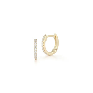 Crafted in 14-karat yellow gold, these elegant huggie earrings feature a total of 0.13 carats of carefully selected diamonds. Each earring contains nine G/H color and SI clarity diamonds, arranged along a 10.5mm length with a delicate 1.3mm width. Designed for comfort and security, they include a hinged lever-back closure, making them a refined choice for everyday wear or special occasions.