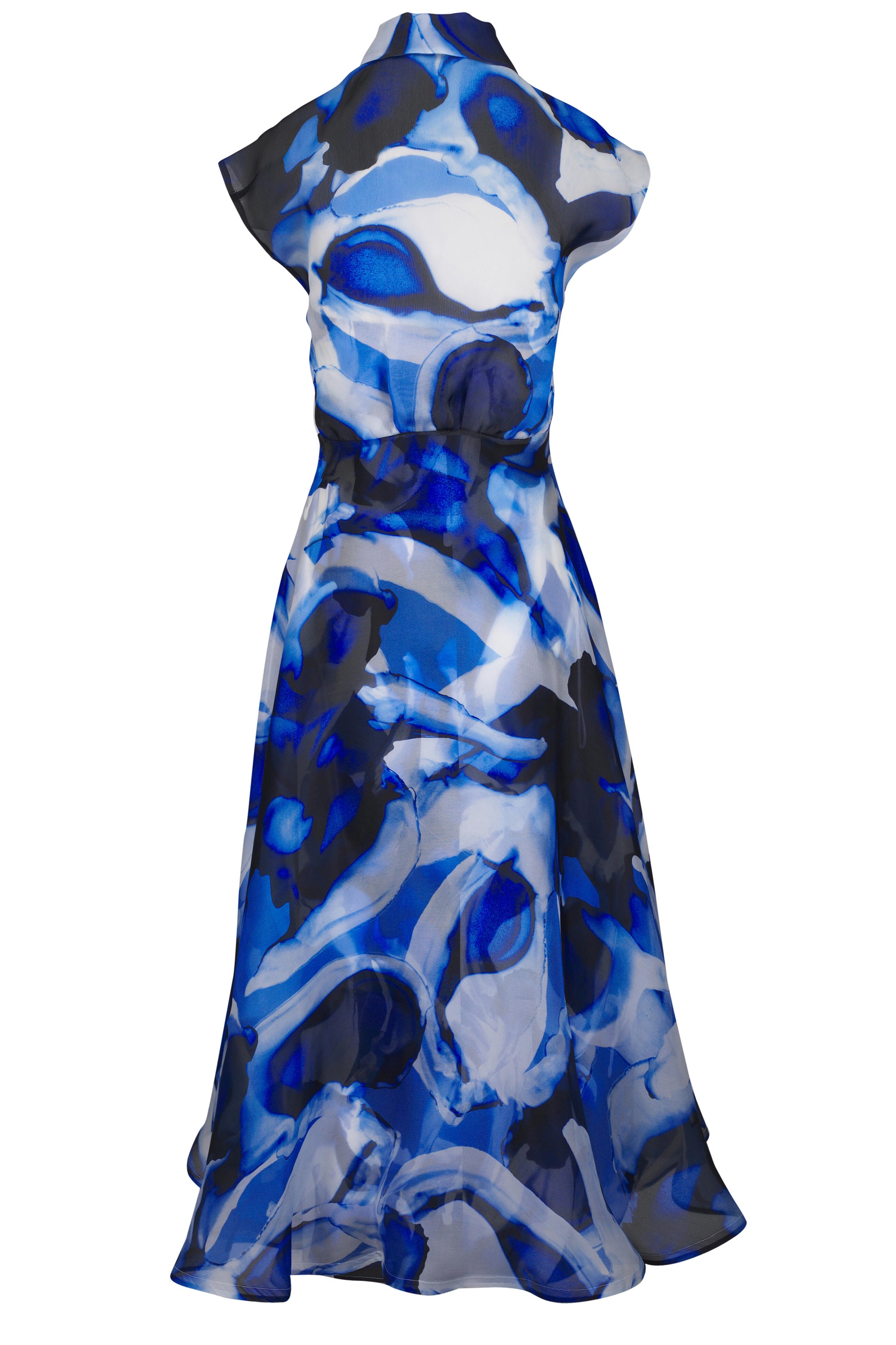 Crafted from luxurious 100% silk, the Elodie Dress features an elegant blue and navy floral print that exudes timeless sophistication. Designed with a classic collar and delicate cap sleeves, this midi-length dress offers a refined silhouette. The belt is sold separately, allowing you to customize your look. Made in Italy to ensure exceptional quality and craftsmanship, the Elodie Dress is perfect for those seeking effortless elegance with a modern touch.