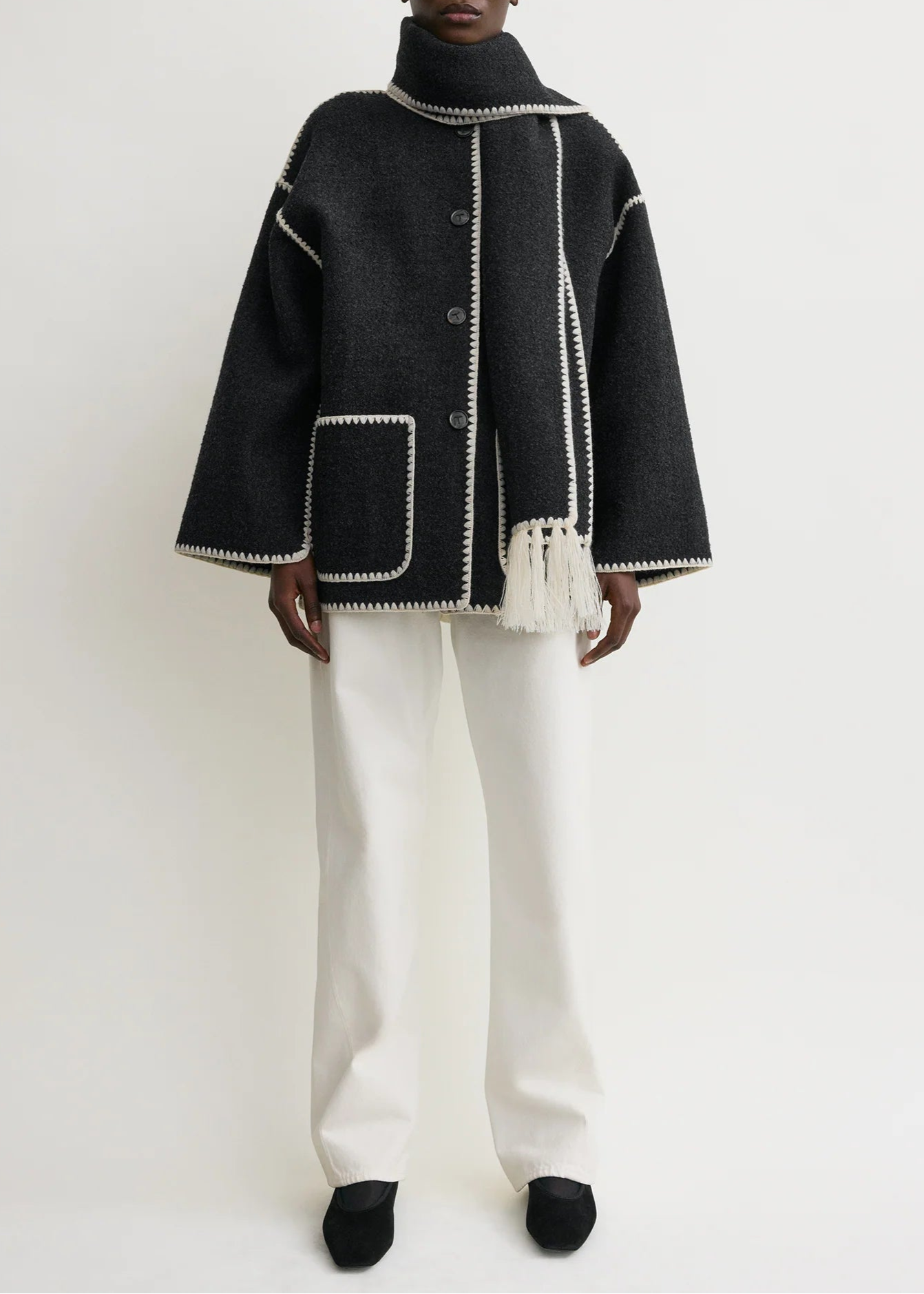 TOTEME coat jacket with an attached scarf embroidered along the edges for an artisanal finish. It is made from heavy and structured wool-blend felt certified by the Responsible Wool Standard and designed for an oversized fit with dropped shoulders, wide sleeves with slits, and patch pockets.