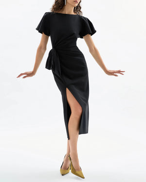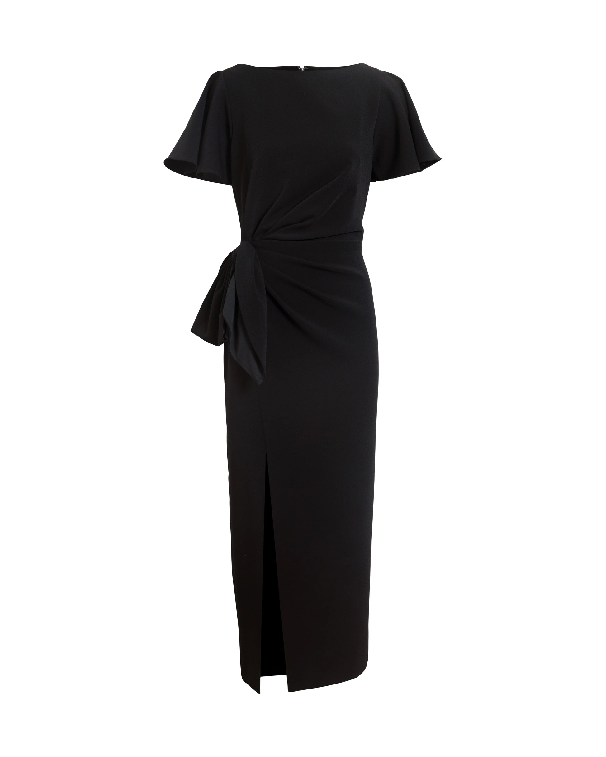 The Emeline Dress combines elegance and subtle allure with its fitted midi silhouette and delicate fluttered sleeves. The waist is gracefully cinched with a bow, adding a refined touch, while a gentle hint of stretch ensures comfortable movement. A tasteful slit introduces just the right amount of drama, making it an ideal choice for evening events where understated sophistication is key.