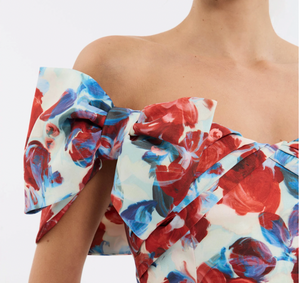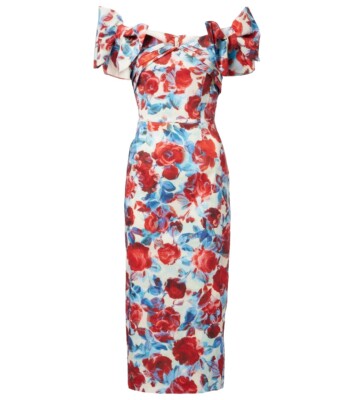 The Fleurette Midi Dress combines classic elegance with contemporary style through its custom floral print on premium stretch taffeta. Its off-the-shoulder sweetheart neckline and twist bust with bow accents create a refined, feminine look. The fitted bodice flows into a sleek pencil skirt featuring a back split for subtle allure. Fully lined and finished with an invisible back zip, this dress offers both comfort and sophistication, making it an ideal choice for memorable occasions.