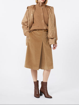 Elevate your wardrobe with these sophisticated velvet culottes, crafted from luxurious 500-line pure cotton velvet. The signature inverted pleat design graces both front and back, creating refined movement while maintaining impeccable silhouette. A slightly flared cut offers comfort without sacrificing elegance, while practical in-seam side pockets add functionality. Finished with sewn darts at the waist for a polished fit and a coordinating coated fabric belt, these culottes seamlessly transition from day to evening wear.