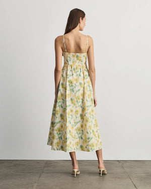 The Gigi Dress captures the season's most coveted aesthetic in a vibrant floral-printed taffeta. This midi silhouette balances refined elegance with effortless wearability, featuring a distinctive folded neckline that creates a clean square neck and a gently cinched waist for a flattering, structured fit. Perfect for elevating any occasion with understated sophistication.