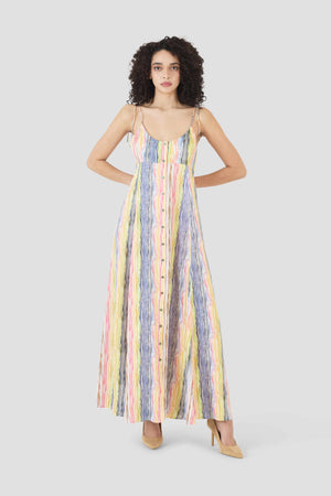 The Rosie Assoulin High Garden Maxi Dress in Rainbow Stripe Twill is a vibrant, breezy piece perfect for warm-weather occasions. Featuring a fitted bodice, flowing maxi skirt, and soft twill fabric with pastel rainbow stripes, it offers effortless elegance. Adjustable tie straps ensure a customizable fit, adding to its charm.