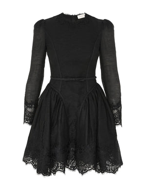 The Hypnotic Lace Trim Mini Dress in black blends silk linen elegance with refined detailing. Featuring a rounded neckline, gathered shoulders, and delicate lace trim at the neckline, cuffs, and hem, this long-sleeved dress offers a graceful silhouette. The removable self-covered bow belt accentuates the waist, while the full flared skirt with tulle inserts adds volume and movement. Fully lined and finished with an invisible back zip, it’s designed to combine comfort with timeless sophistication. Perfect for elevated occasions this fall.