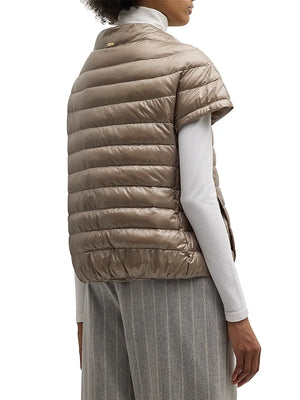 The Iconico "Greta" Cap Sleeve Coat merges refined elegance with practical performance. Crafted by Herno, this water-resistant jacket features a lustrous quilted shell that catches the light beautifully, while premium down fill provides exceptional warmth without bulk. Distinctive cap sleeves add a polished, contemporary silhouette to this versatile outerwear essential. Perfect for transitional seasons or layering through winter, it's designed for those who refuse to compromise between style and function.