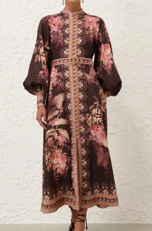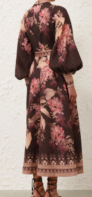 The Zimmermann Illuminate Buttoned Midi Dress in Black Floral from our Spring 2025 Collection, Illumination. A linen midi dress featuring long blouson sleeves with elongated cuffs and zips, raffia buttons down the center front, and a self covered belt with a raffia buckle.