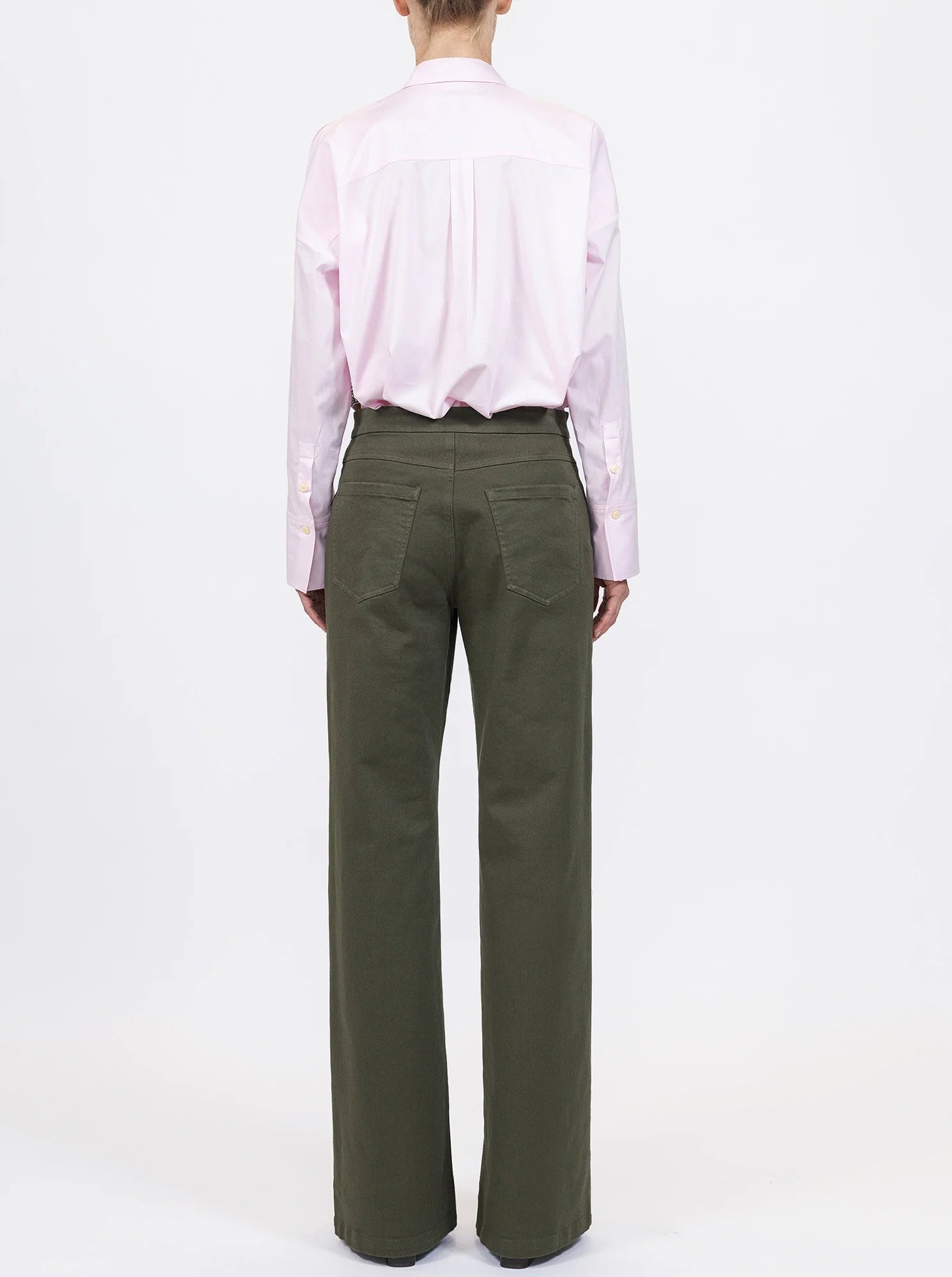 The Jane Pant features a flattering high-rise silhouette with a contoured waistband positioned just below the natural waist. The flare leg creates an elongated, lean line while the structured denim twill—comparable in weight to classic 12oz. stretch denim—provides comfort and durability. Finished with tonal topstitching for a refined, understated elegance, this versatile pant effortlessly transitions from casual to polished occasions.