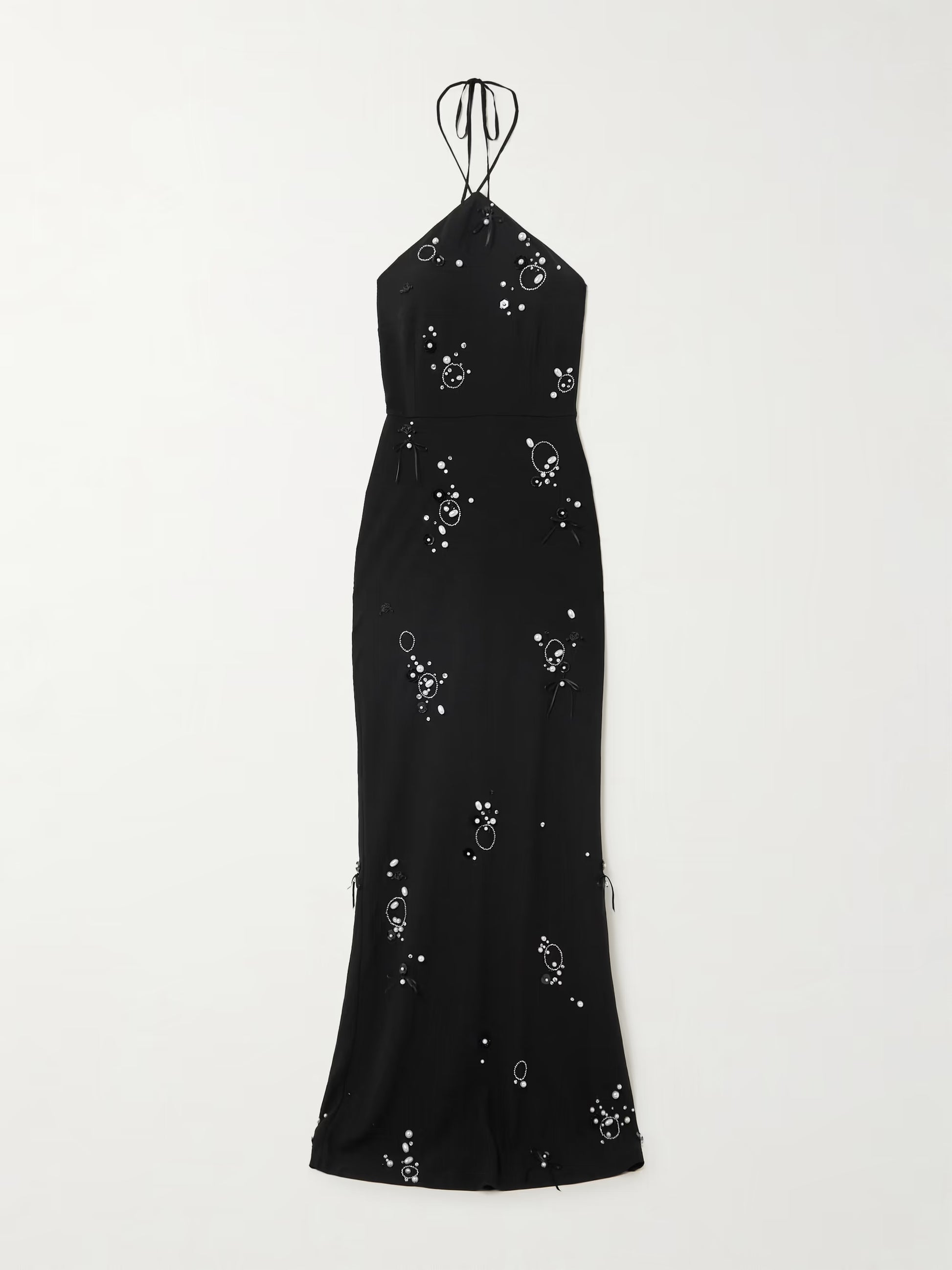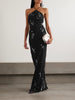 The Jolene Embroidered Long Dress epitomizes refined elegance. Crafted from supple crepe, this halterneck gown flows gracefully to the floor with an air of understated luxury. Intricate embellishments—satin ribbons, shimmering crystals, sequins, and faux pearls—create a captivating interplay of texture and light. The stretchy fabric ensures a comfortable, flattering fit for any occasion. Pair with elevated pumps to showcase the dramatic hem and complete your sophisticated ensemble.