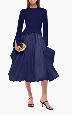 The Kenlie L/S Mock Neck Midi Dress by SIMKHAI features a sophisticated split design, combining a rib-knit mock turtleneck bodice with long sleeves and split cuffs, paired with a gathered full bubble skirt. Crafted from a blend of polyester and nylon, with fabric variations in rayon and polyester combos, this dress offers both structure and fluidity. Designed to pull over easily, it requires dry cleaning to maintain its refined silhouette. Imported for quality assurance, the Kenlie dress balances modern edge with elegant detailing for a standout look.