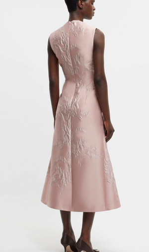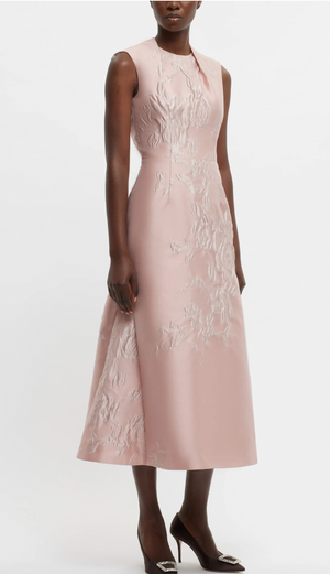 The Kiss Dress Pink embodies Emilia Wickstead’s signature blend of timeless elegance and modern design. Made from jacquard fabric featuring a woven rose floral motif, this fit-and-flare dress offers a flattering silhouette enhanced by sculptural darting at the neckline. The refined detailing shapes the bodice with precision, making it an ideal choice for sophisticated occasions.