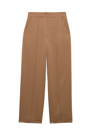 The Kyra Wide Leg Pant in Chai combines refined tailoring with effortless elegance. Crafted from luxurious satin, these high-waisted trousers feature a pristine front and gracefully sweep into a wide leg silhouette, finished with a crisp hem. The subtle sheen and tailored ease create a polished look that transitions seamlessly from day to evening, making them an essential addition to any sophisticated wardrobe.