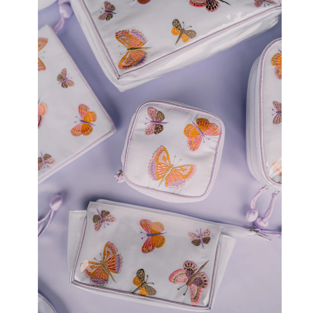 The Butterfly Small Makeup Bag is perfect for quick overnight trips or weekend getaways, offering just the right amount of space for your beauty essentials. Featuring an elegant envelope-style design, this embroidered bag is wrapped and lined in a clear, easy-to-clean material that protects its vibrant butterfly motif.
