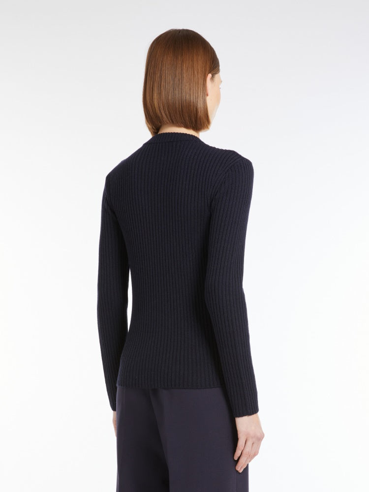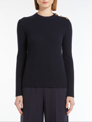 The Max Mara long-sleeved jumper made of a luxurious pure-wool yarn in a ribbed knit. Streamlined style featuring three metal buttons embroidered sailor-style onto the left shoulder.