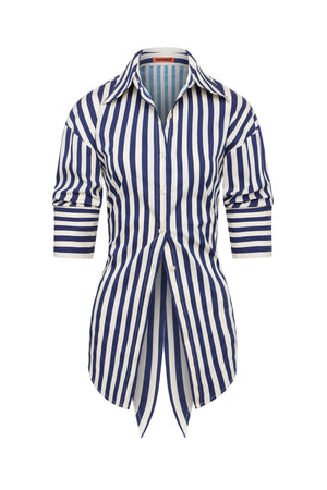Introducing the Loch Poplin Button Up Shirt—a refined staple crafted from stretch cotton poplin in a timeless navy and cream stripe. This sophisticated piece features an elegant cut-out back with an adjustable tie, allowing you to customize the fit to your preference. Effortlessly transitions from polished office wear to relaxed weekend styling, making it an indispensable addition to any wardrobe.