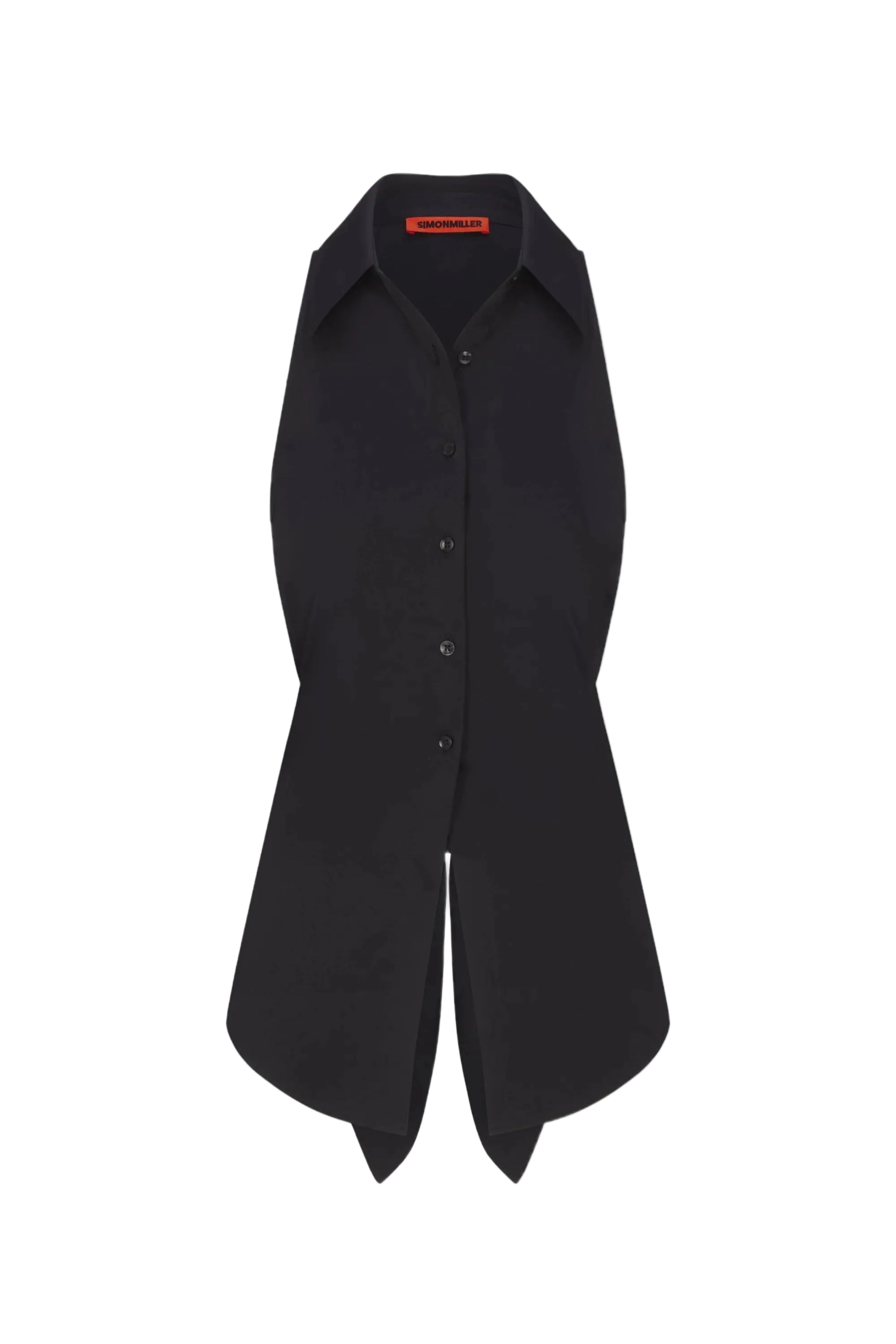 The Loch Sleeveless Button Up Shirt combines timeless elegance with practical versatility. Crafted from a midweight poplin blend of 75% cotton, 22% nylon, and 3% spandex, this piece offers both structure and subtle stretch for all-day comfort. The front button closure provides classic styling, while the optional back tie closure allows you to adjust the fit and create a refined silhouette. Perfect for layering or wearing solo, this sophisticated staple transitions effortlessly from office to evening. Dry clean only.