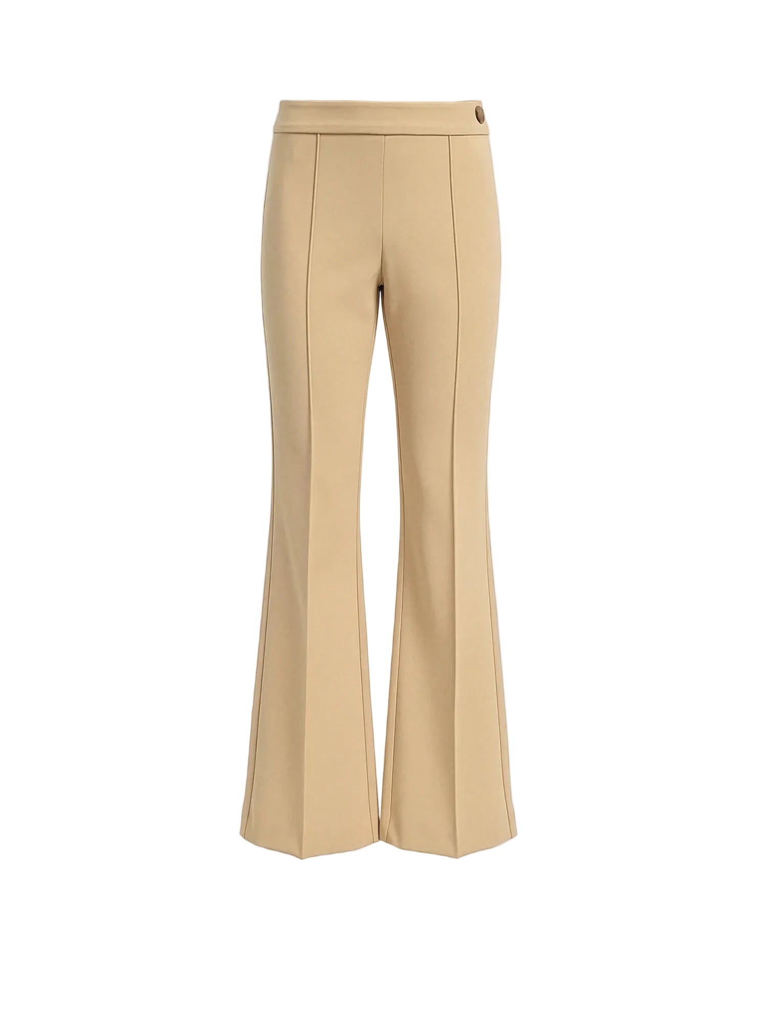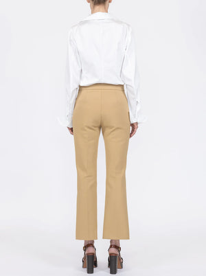 The Lola Pant reimagines the classic flared trouser with contemporary sophistication. Crafted from stretch cotton crepe double-knit jersey, this high-rise style features a flat waistband at the natural waist and a slim silhouette that gracefully flares from the knee to a cropped hem. A precisely stitched front crease enhances the lengthening effect. The fabric's distinctive matte, compact finish delivers exceptional stretch while maintaining its shape, ensuring all-day comfort and effortless movement.