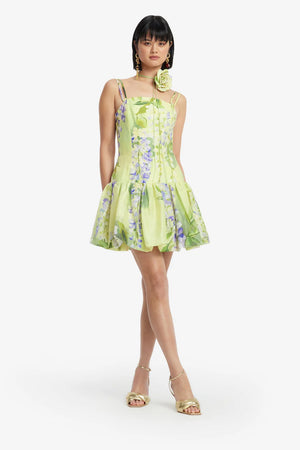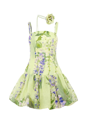 Cascading lilac wisteria blooms drift gracefully across a soft lime canvas in this enchanting print. The Lorena Puff Mini Dress captures the essence of a sun-drenched garden awakening to spring—evoking that serene, weightless feeling of floating through fresh air and tranquility. Perfect for those who appreciate nature-inspired elegance with a contemporary edge.