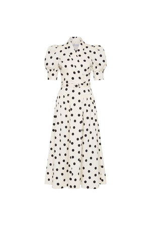 The Maisie Midi Dress offers a refined blend of classic charm and modern style with its monochrome polka dot print. Featuring short puff sleeves and a V-neckline framed by a shawl lapel, it exudes sophistication. A drop waist, princess seams, and a self-belt define an elegant silhouette, while the side-gathered midi skirt with a front yoke adds subtle detail. Fully lined and secured by a back zip, this dress transitions seamlessly from daytime occasions to evening affairs.