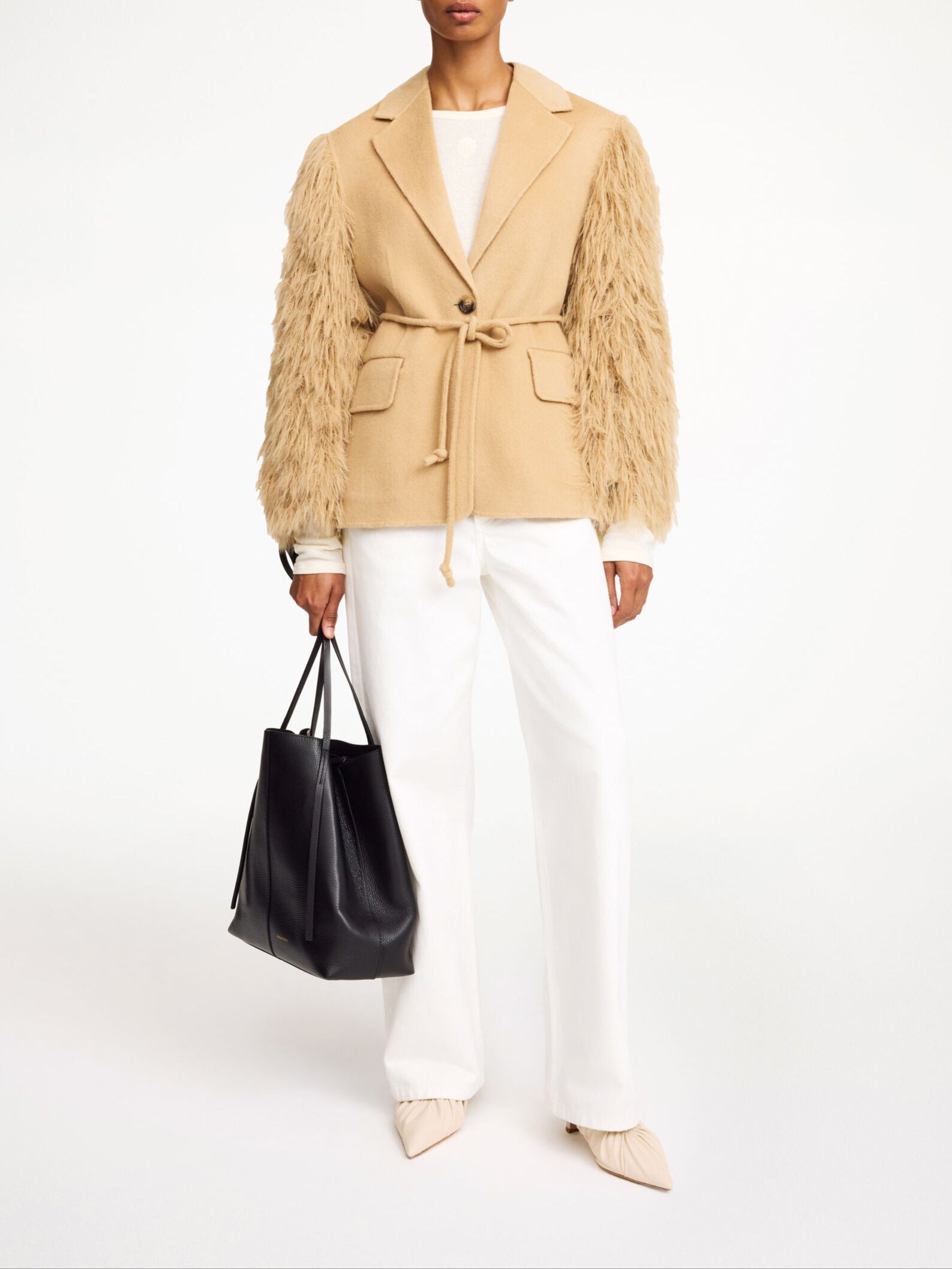 Crafted from heavy wool, the Manteau Coat redefines the classic blazer with plush feathery fringes adorning its sleeves, creating a distinctive bohemian silhouette.