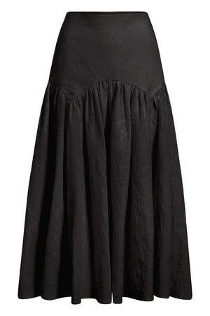 The MARÉE Midi skirt embodies understated elegance with its fitted scalloped yoke and graceful silhouette. Crafted from supple cotton jacquard, the fabric's subtle texture adds refined dimension to this timeless piece. A discreet side zipper allows for effortless dressing, while its versatile design transitions seamlessly from tailored blouses to relaxed knits. Thoughtfully constructed and enduringly charming, this wardrobe essential whispers sophistication through every carefully considered detail.