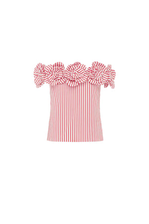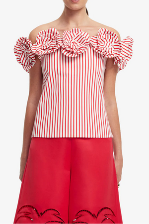 Elegant off-shoulder silhouette featuring bold red and white stripes with delicate ruffle detailing. A timeless piece that effortlessly transitions from casual to refined occasions, offering a flattering neckline and romantic aesthetic.