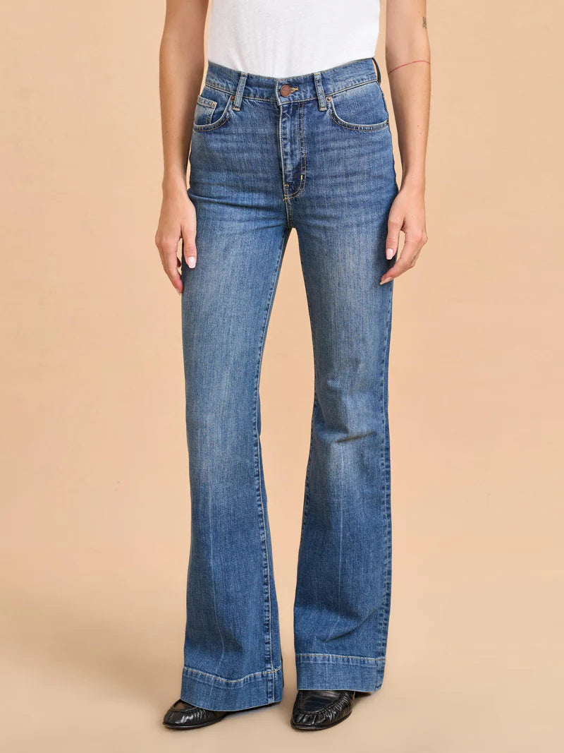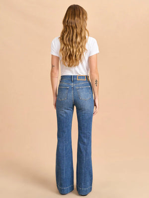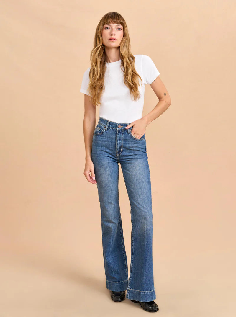 Based on a vintage style co-founder Meredith Melling was snapped in for a street style blog that went viral. We recreated the high-rise flare silhouette, added a touch of stretch and made sure they were Meredith Melling approved. Pair back to one of our denim shirts to replicate Mer's timeless look. *This jean runs small, we recommend you size up in this style.