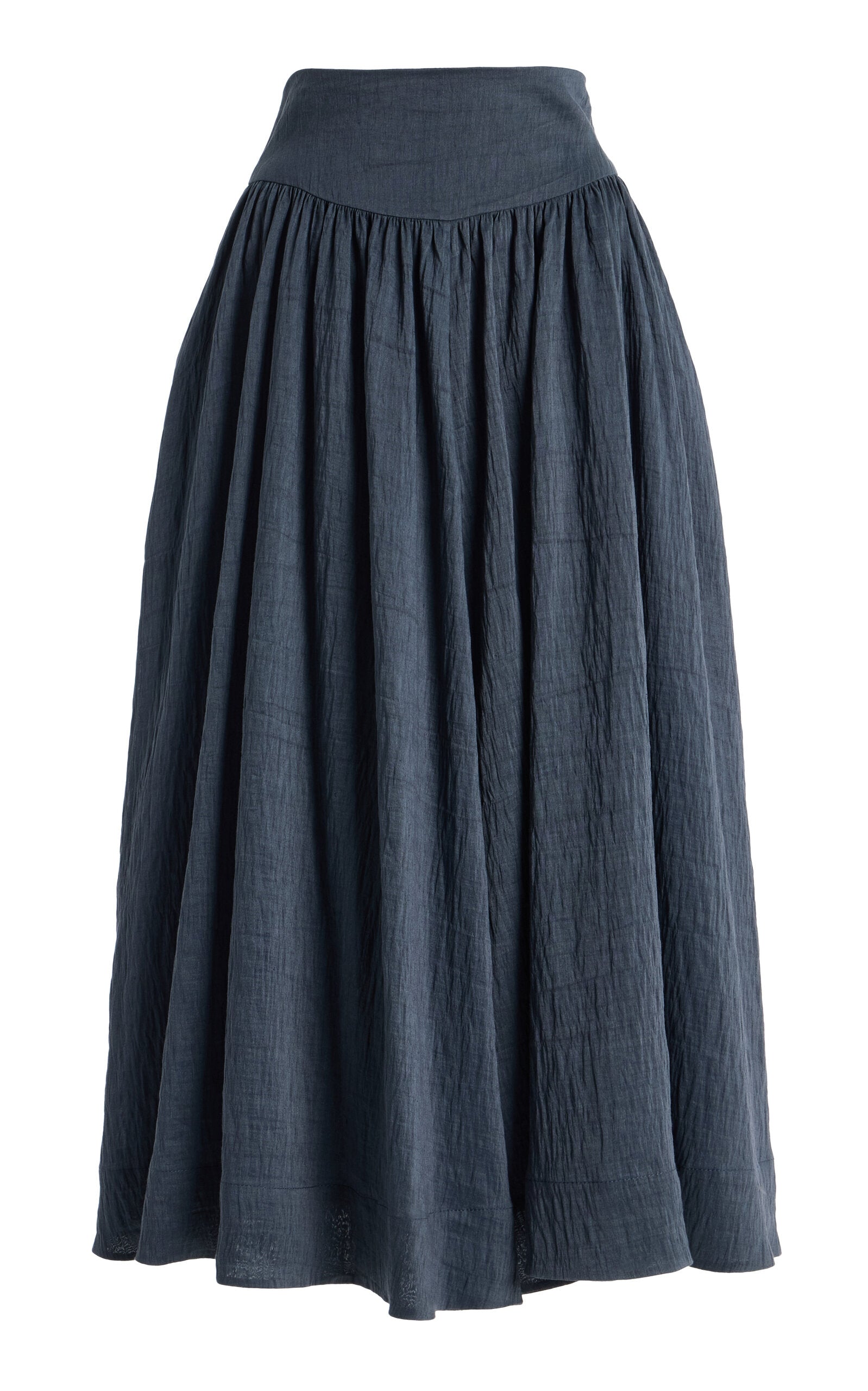 The MIRE Skirt captures effortless sophistication through premium linen construction and thoughtful design details. A fitted yoke gracefully transitions into a gathered midi silhouette that moves beautifully with every step. Practical side seam pockets and a concealed zipper maintain the refined aesthetic, while a soft cotton voile lining ensures all-day comfort against the skin. Layer it with the CAPTIVA Top to create a cohesive, elevated linen ensemble.