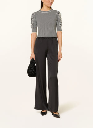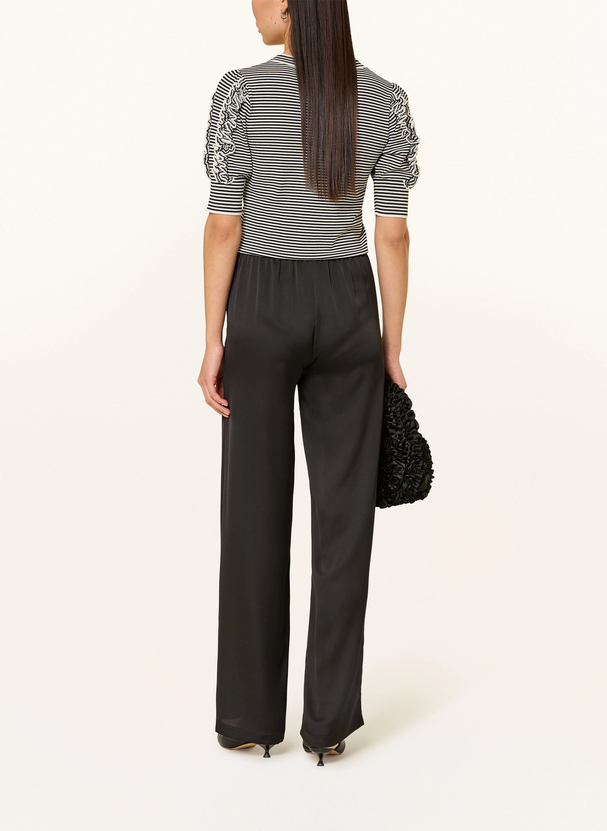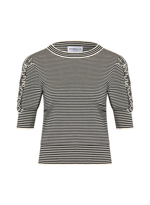 The Mlsrefolo Top combines refined elegance with contemporary style. Crafted from fine knit fabric with a subtle light texture, this piece features a classic crew neck and three-quarter sleeves finished with ribbed cuffs for a polished look. The straight cut silhouette flatters effortlessly, while delicate ruffles and a striped print add visual interest. Ribbed cuffs at the hem provide structure and definition. Made from stretch fabric, it moves with you throughout your day while maintaining its sophisticated shape.