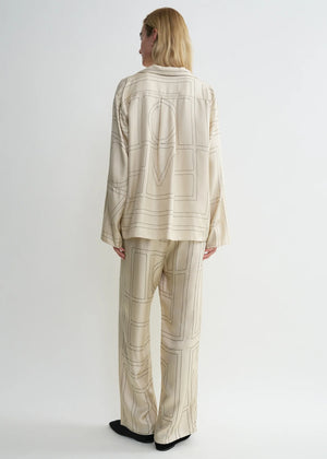 TOTEME blouse made from mid-weight silk twill embroidered with a fine monogram pattern in contrasting black thread. It is shaped to a relaxed silhouette with a lapel collar and spacious long sleeves, and fastens with mother-of-pearl buttons. Wear it all day with the Monogram silk bottoms.